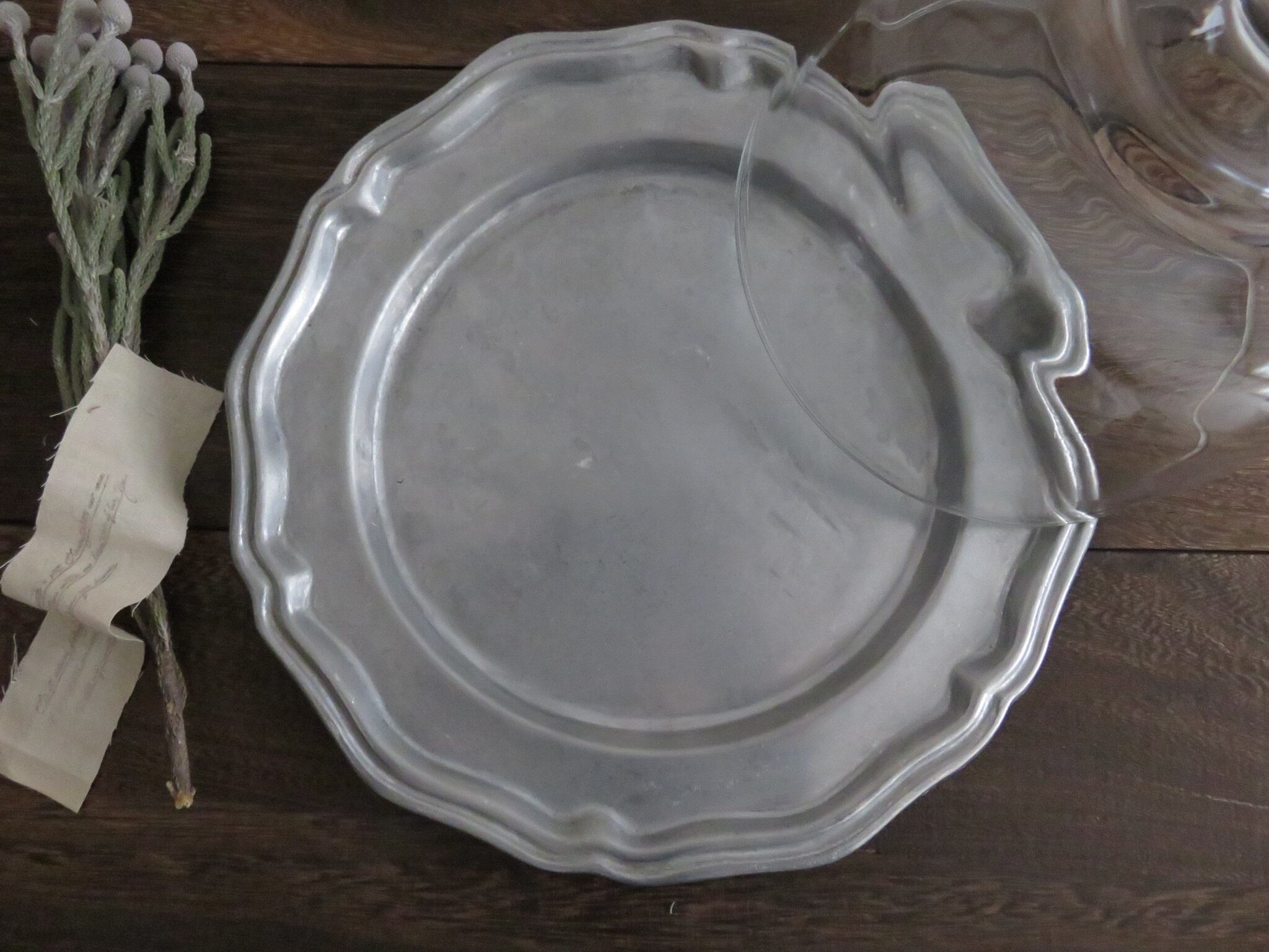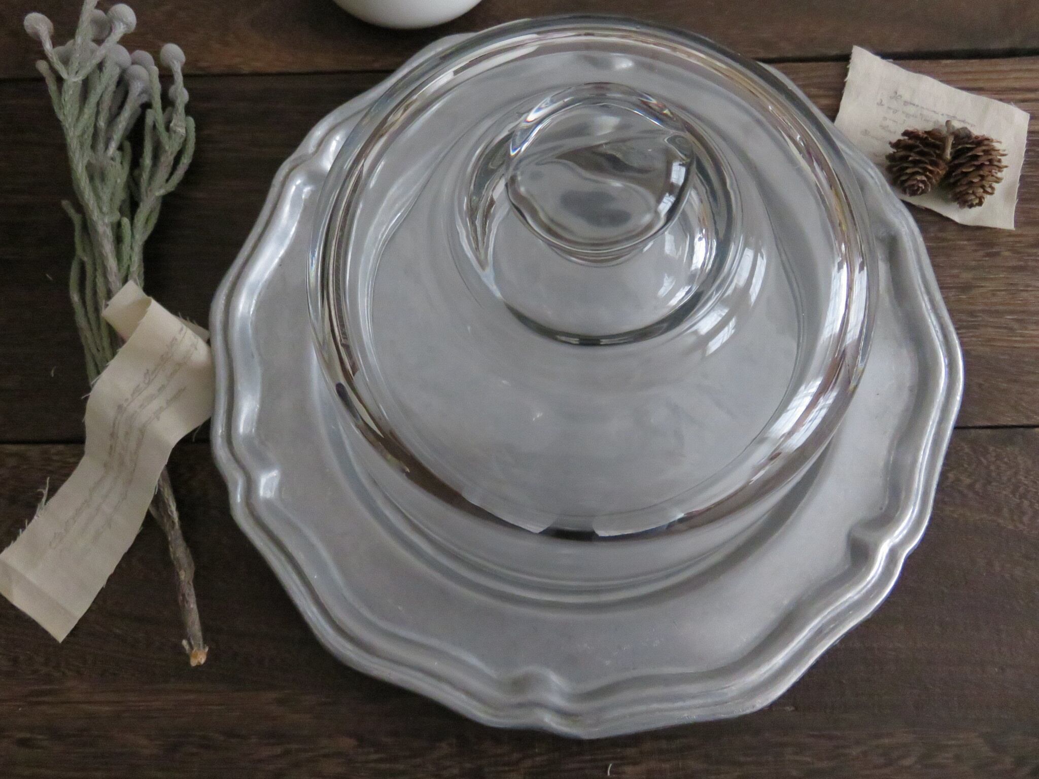 ピューター皿とガラスドームが調和し、お互いに引き立て合っています。
