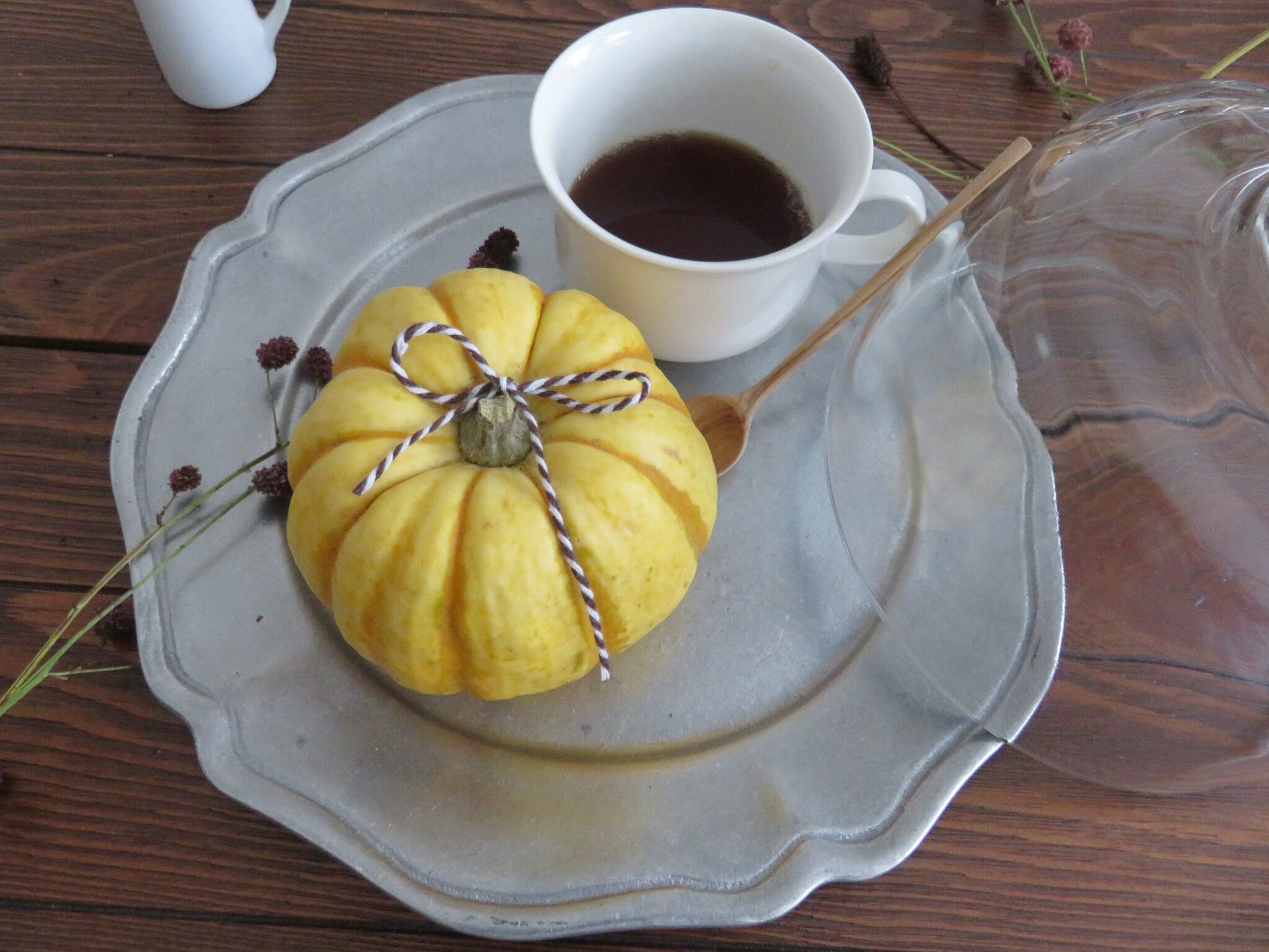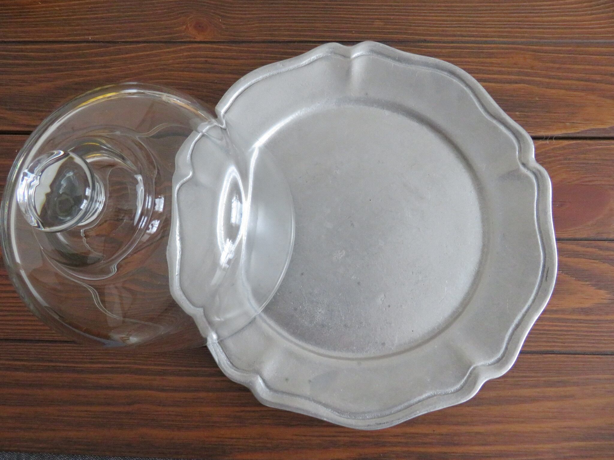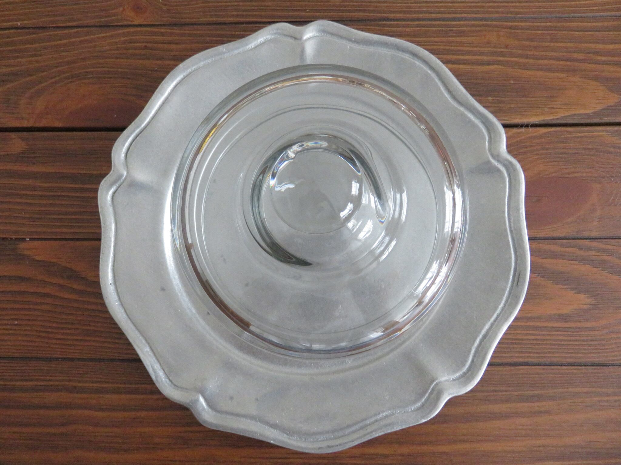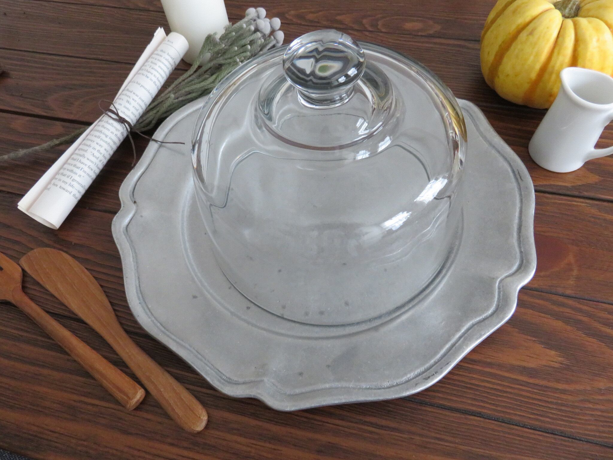 アメリカOneida社のヴィンテージピューター皿とガラスドームの組み合わせです。