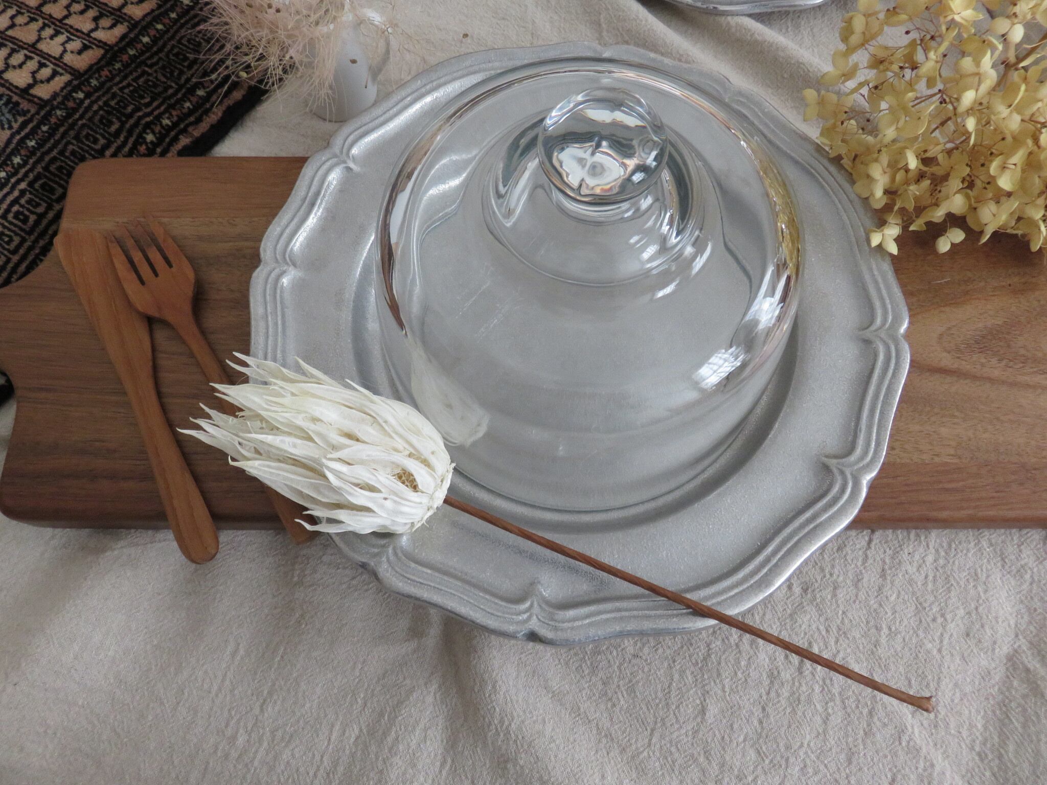 Wilton Columbia社のヴィンテージピューター皿とガラスドームの組み合わせです。