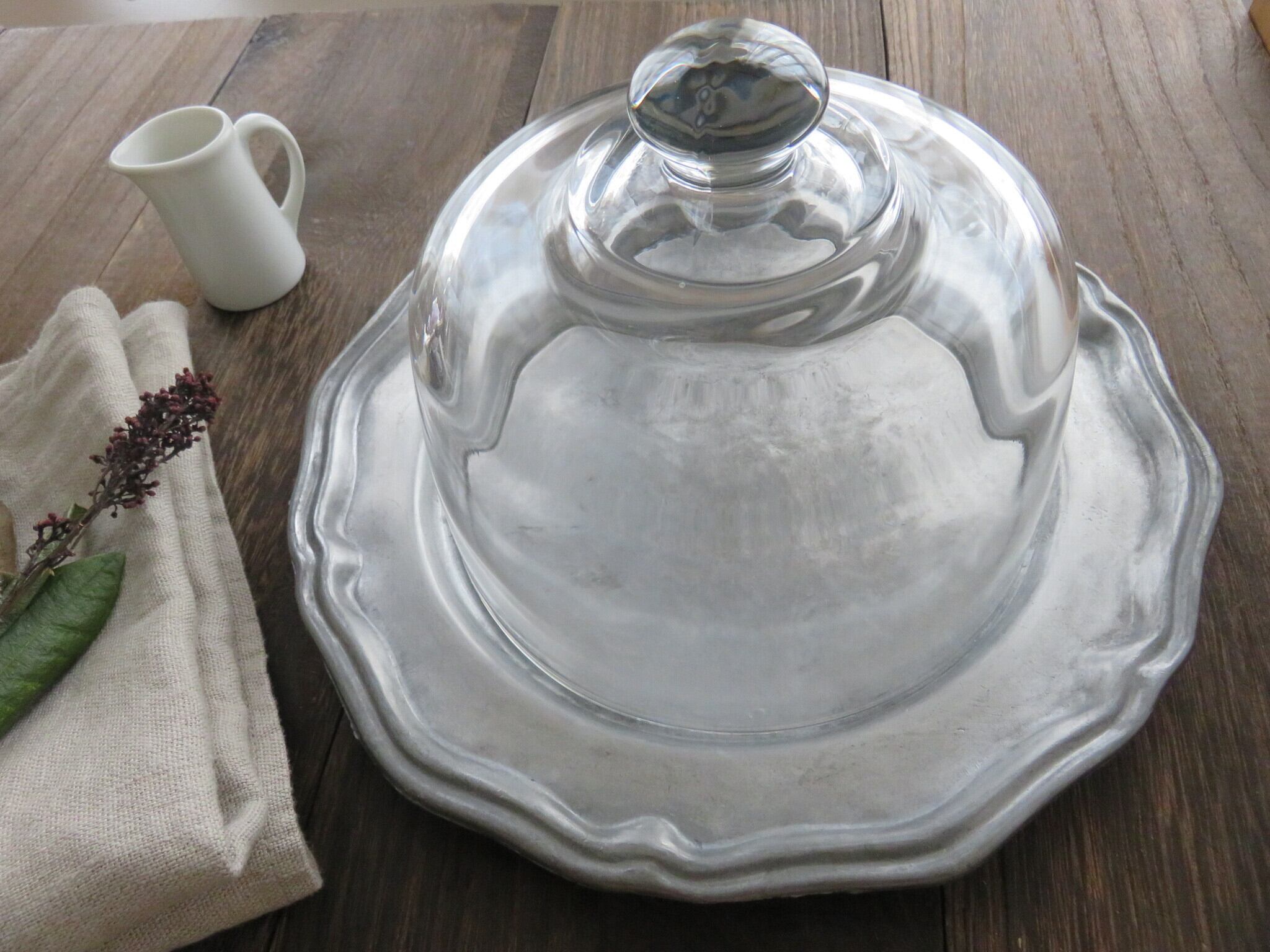 ピューター皿とガラスドームが調和し、お互いに引き立て合っています。