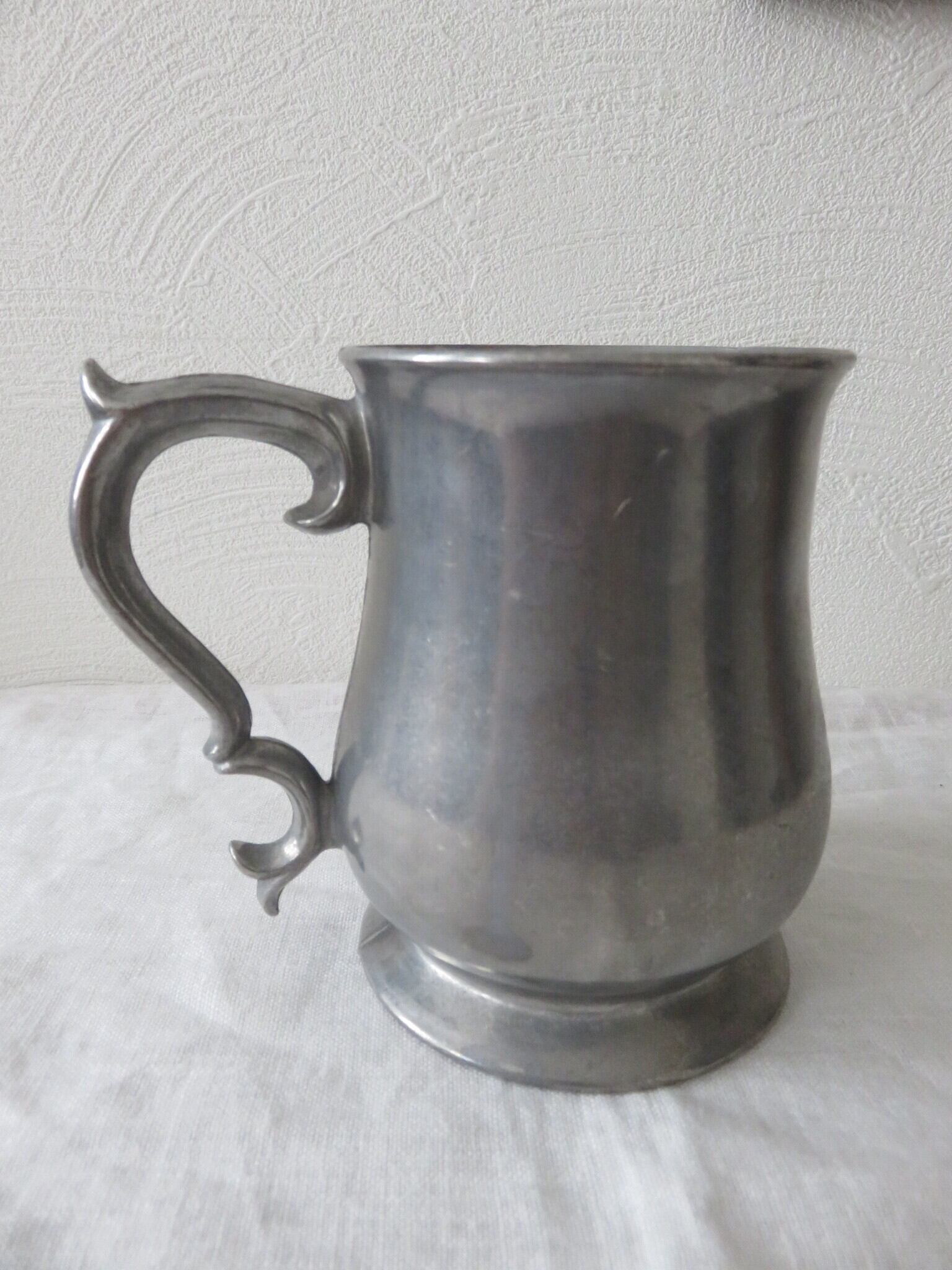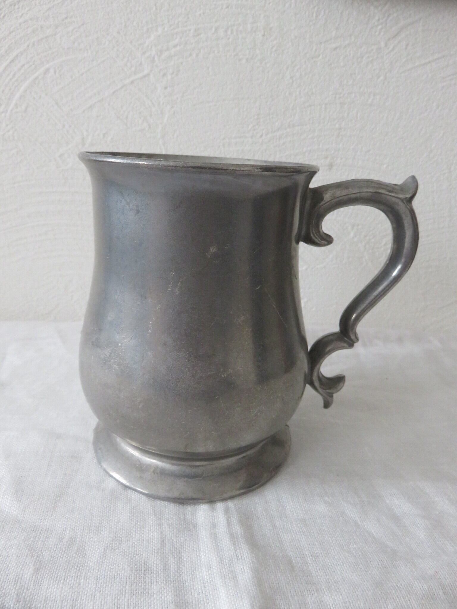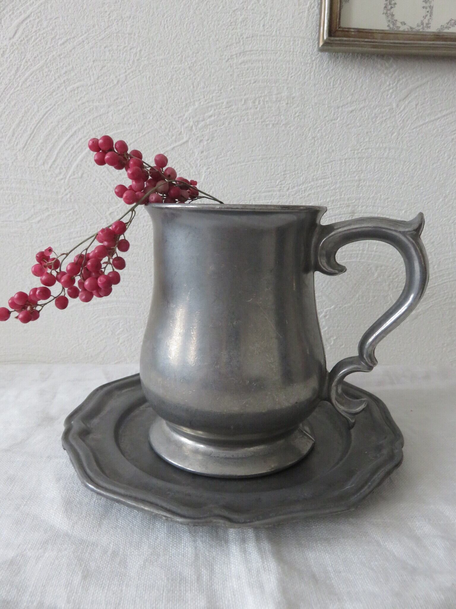 ピューターマグカップの丸みを帯びた形と独特の質感。